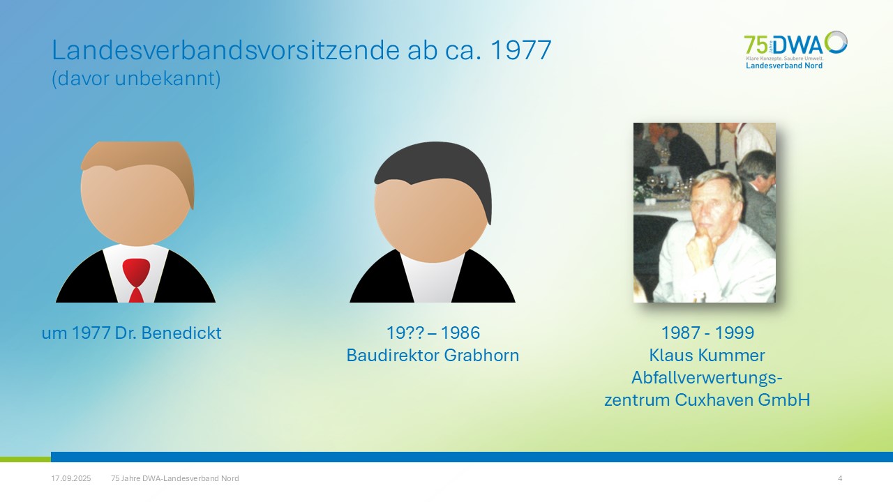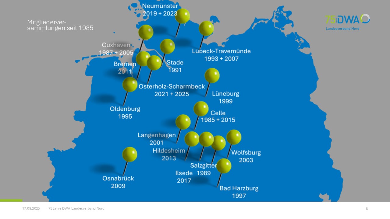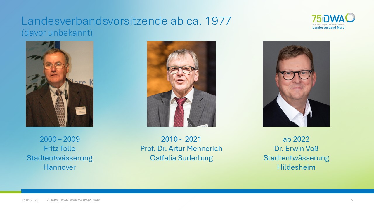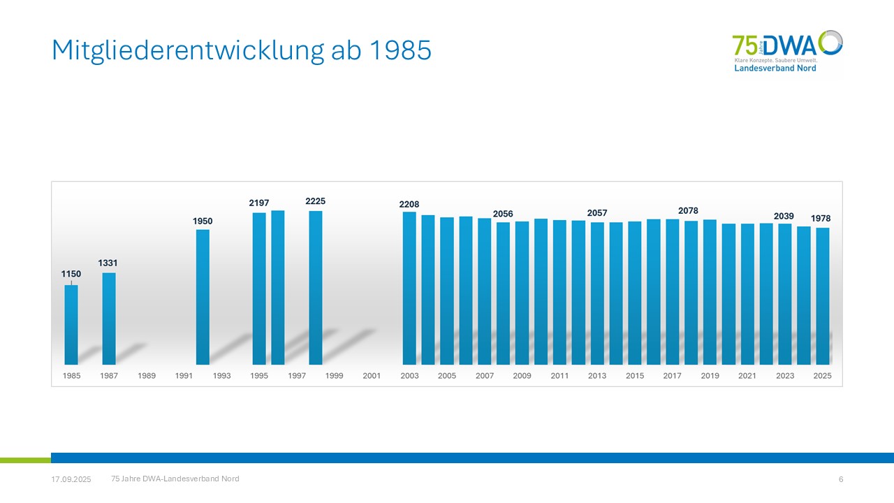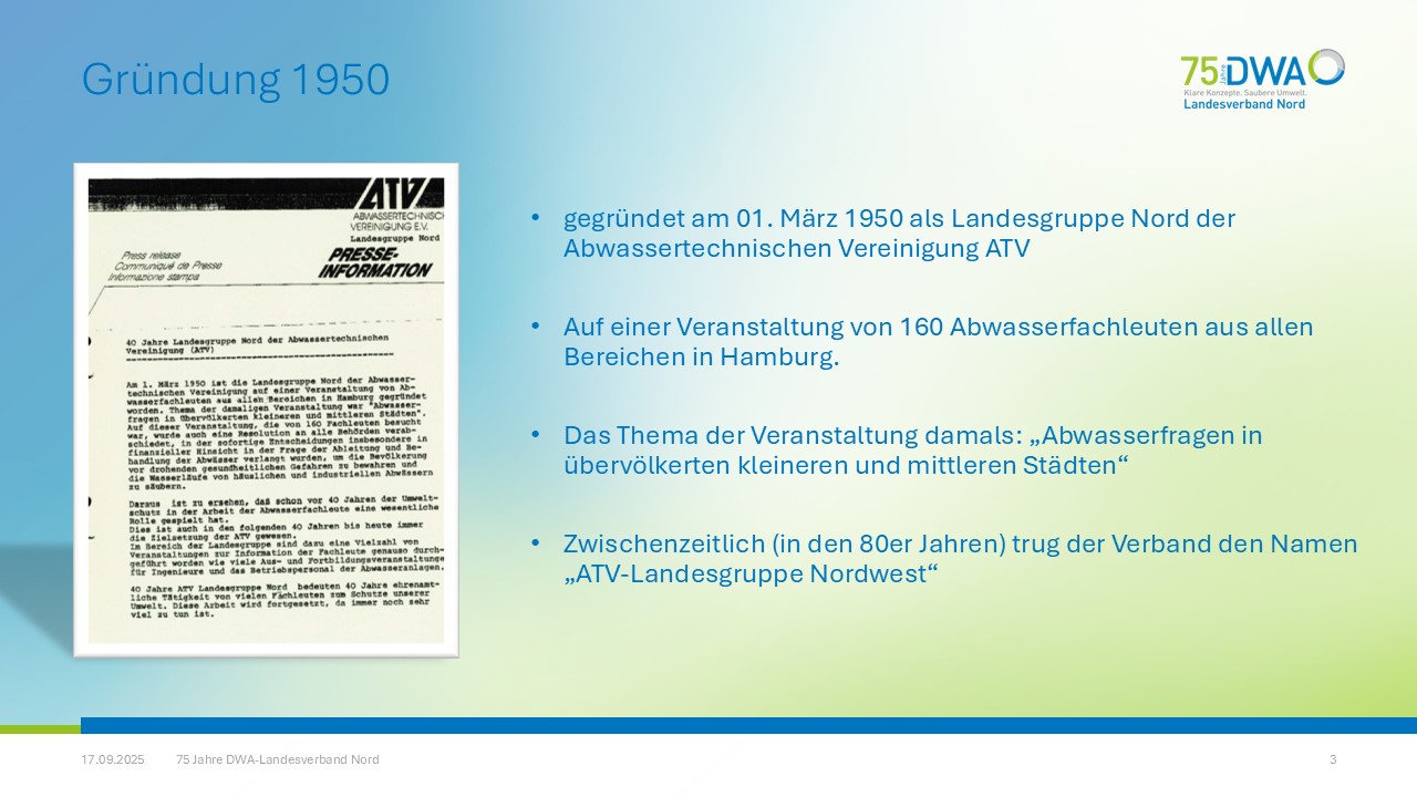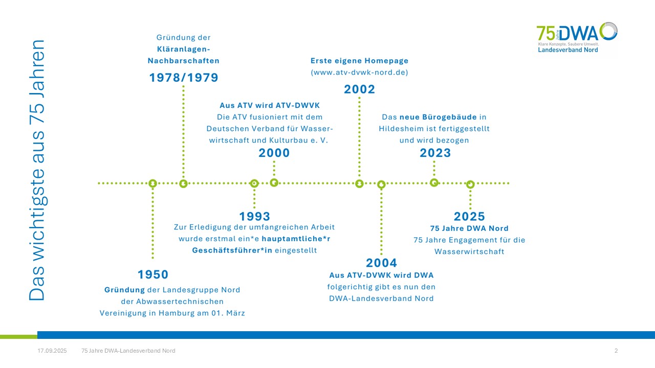Gegründet hat sich der DWA-Landesverband Nord Verband am 01.03.1950 in Hamburg als Landesgruppe Nord der Abwassertechnischen Vereinigung auf einer Veranstaltung von 160 Abwasserfachleuten. Im Jahr 2025 feiert der Landesverband sein 75-Jähriges Jubiläum! Heute betreut der Landesverband mit Sitz der Geschäftsstelle in Hildesheim 2.000 Mitglieder in Niedersachsen, Schleswig-Holstein, Hamburg und Bremen.