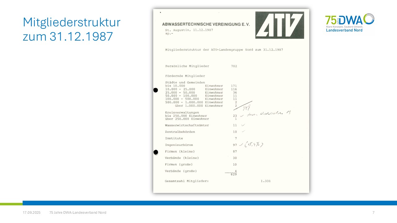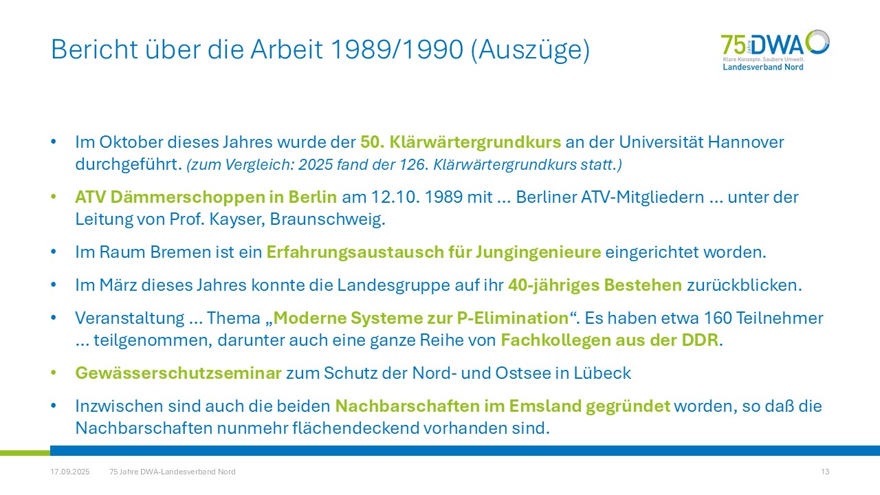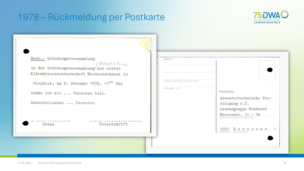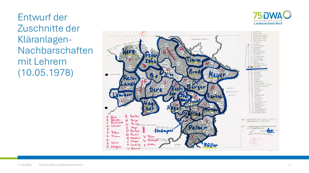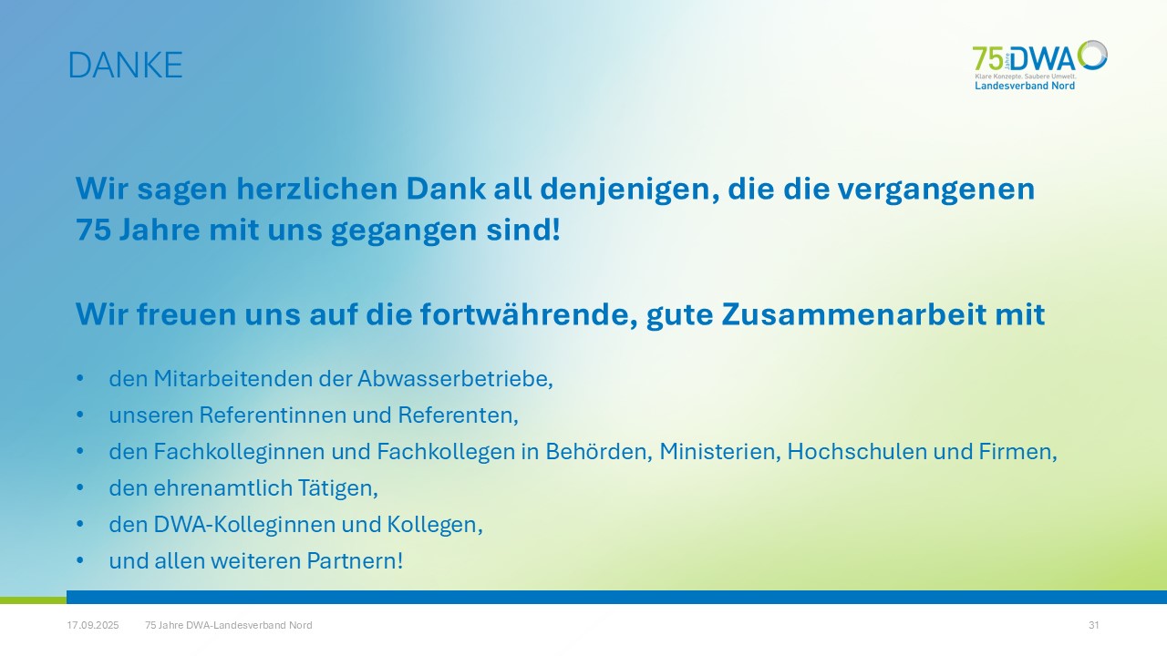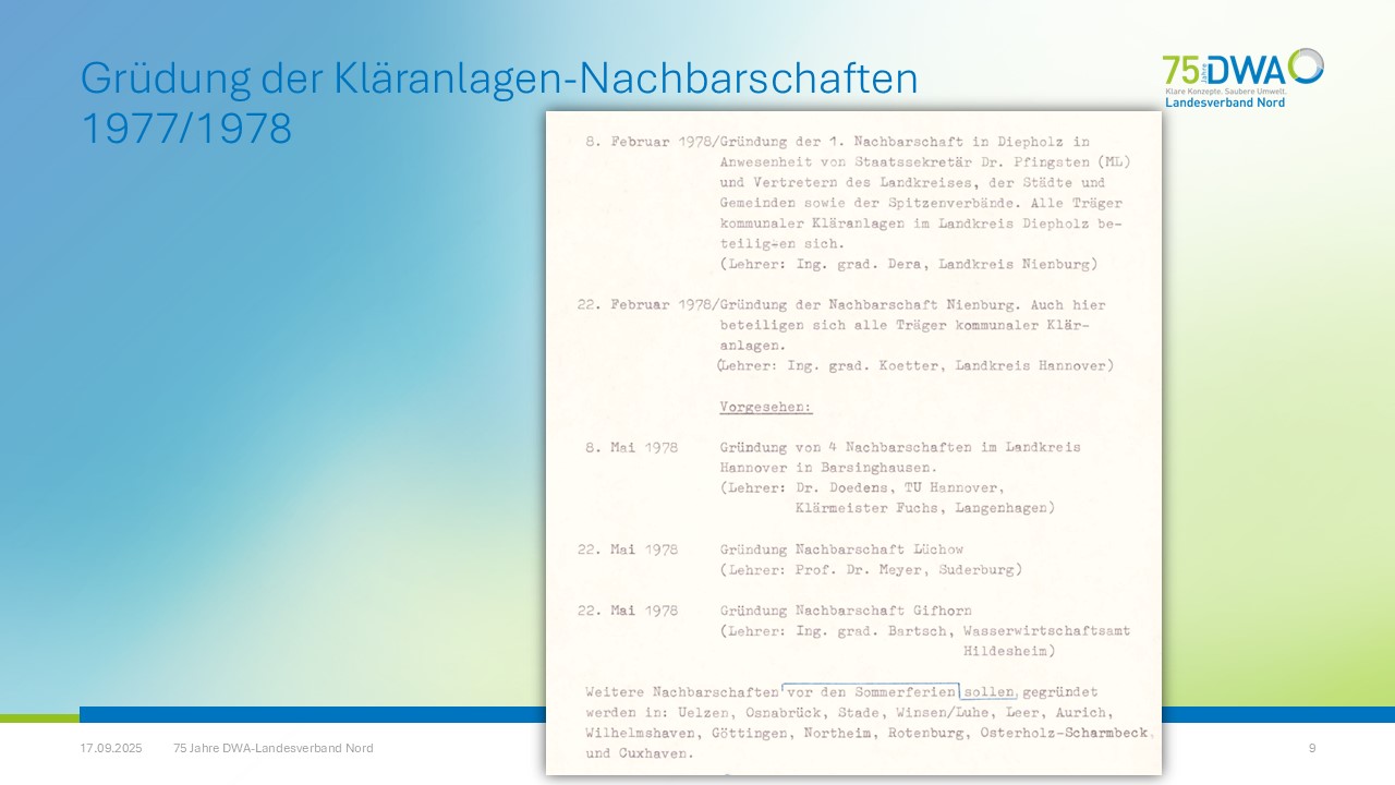 Gegründet hat sich der DWA-Landesverband Nord Verband am 01.03.1950 in Hamburg als Landesgruppe Nord der Abwassertechnischen Vereinigung auf einer Veranstaltung von 160 Abwasserfachleuten. Im Jahr 2025 feiert der Landesverband sein 75-Jähriges Jubiläum! Heute betreut der Landesverband mit Sitz der Geschäftsstelle in Hildesheim 2.000 Mitglieder in Niedersachsen, Schleswig-Holstein, Hamburg und Bremen.